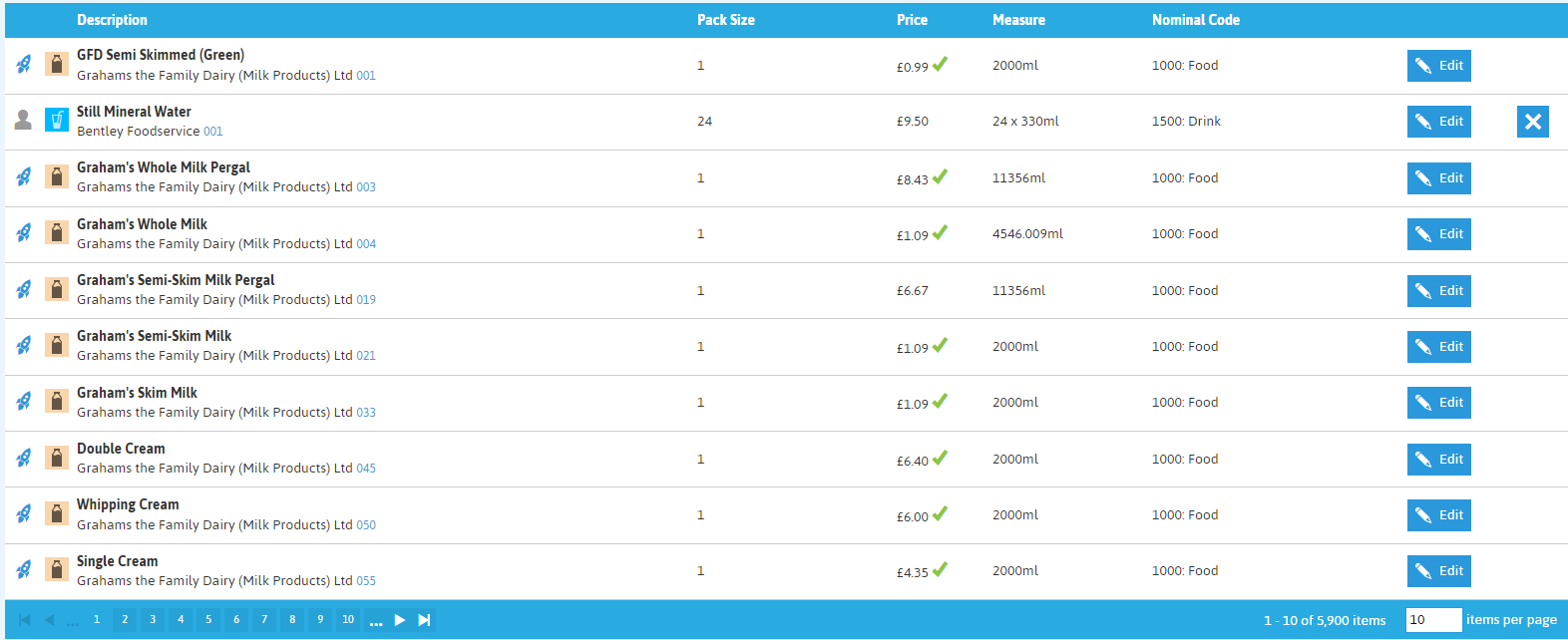 ![]() | Edit - allows you to enable/disable products showing in different Pi modules, view supplier's accreditations (system suppliers only) and set up accounts (user-managed suppliers only). Delete - allows you to delete a supplier (user-managed suppliers only), as long as products within have no links to recipes, stock history, orders or invoicing. |