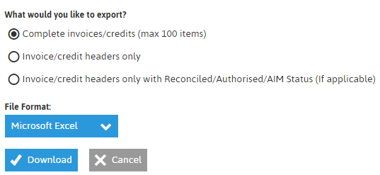 When viewing an invoice/credit, you will see line by line invoice data and a VAT summary. You can use the Share tab to email invoices/credits, or use the Actions drop-down to download in three different formats: