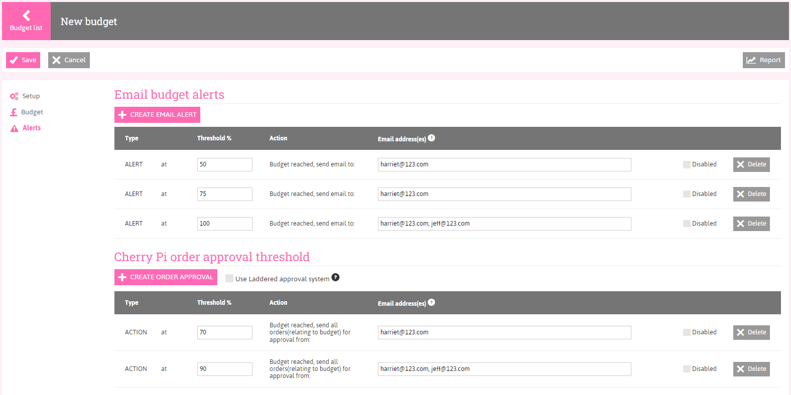 Approval Thresholds - work in the same way as Budget Alerts, but also link in with Pi's Cherry Pi module. By setting these up, a Cherry Pi order has to be approved before being sent.