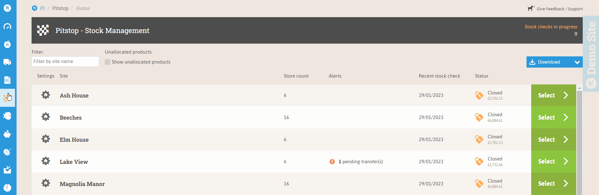 You can download store sheets to complete a stock check (if not using a smartphone or tablet) by selecting the printer icons located to the right of each store. To download all store sheets, select the icon against All Stores at the very bottom. Store sheets are downloaded in PDF formats.