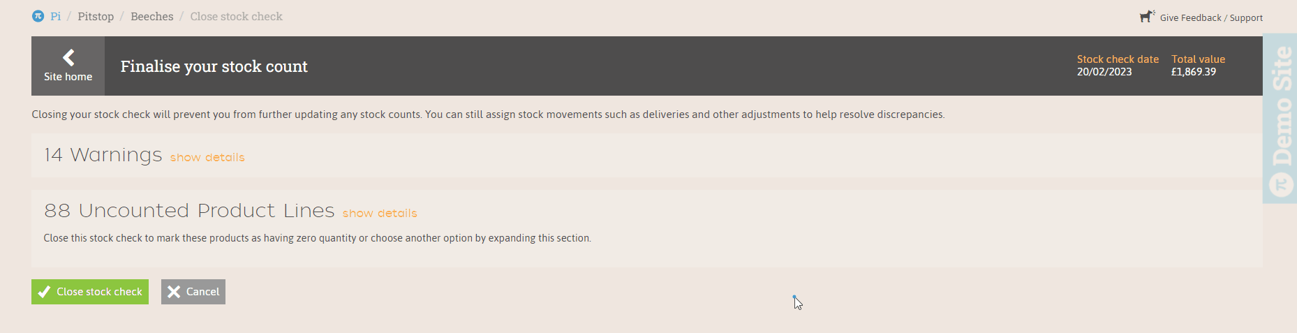 Only the most recently closed stock check can be re-opened. Contact the Pi Helpdesk if this feature is not available to you.
